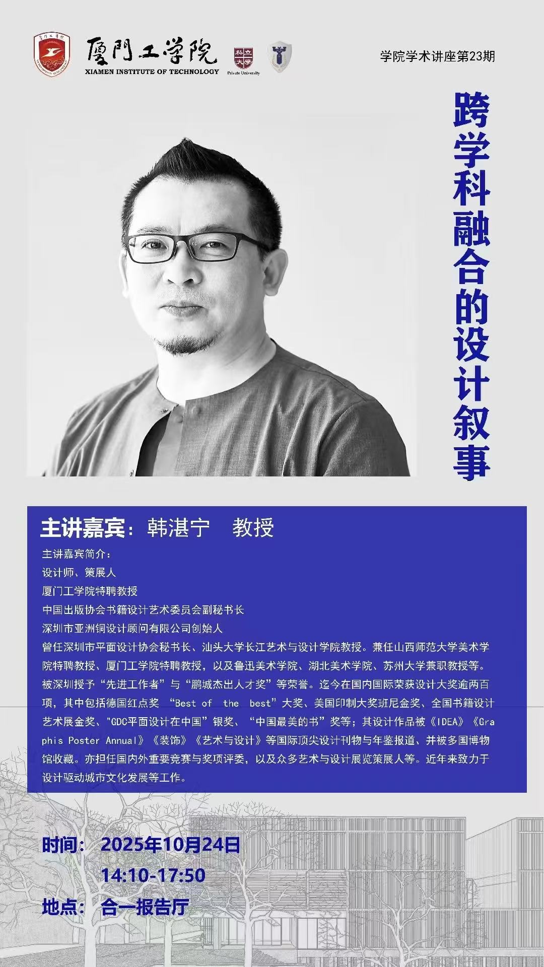 2025年10月24日,我院第二十三期“学院知识讲座”在合一报告厅成功举办。本次讲座以“跨学科融合的设计叙事”为主题,特邀著名设计师、策展人韩湛宁教授作为主讲嘉宾,为现场同学带来一场思想与灵感交织的学术盛宴。