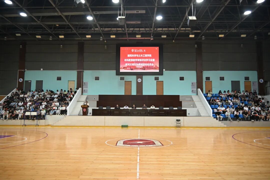 为迎接新一轮本科教育教学审核评估,强化学风建设,引导广大同学以最佳状态投入校园生活,10月14日,我院在室内体育馆召开“本科教育教学评估学习会暨系列文明行为养成活动动员会”。