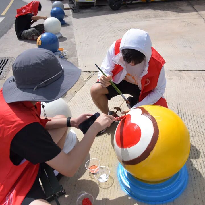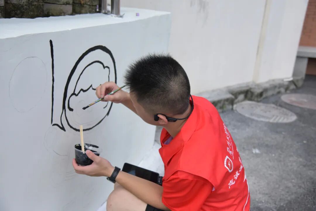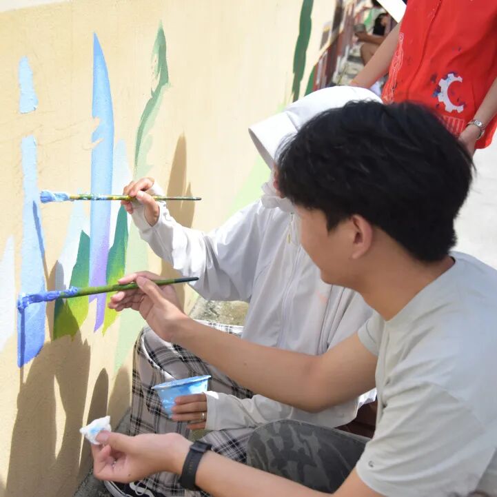 正午的阳光炙热逼人,墙面烫得仿佛能烤熟鸡蛋,但队员们依旧专注勾勒线条、调配色彩。汗珠顺着脸颊滑落,却没人停下手中的画笔。