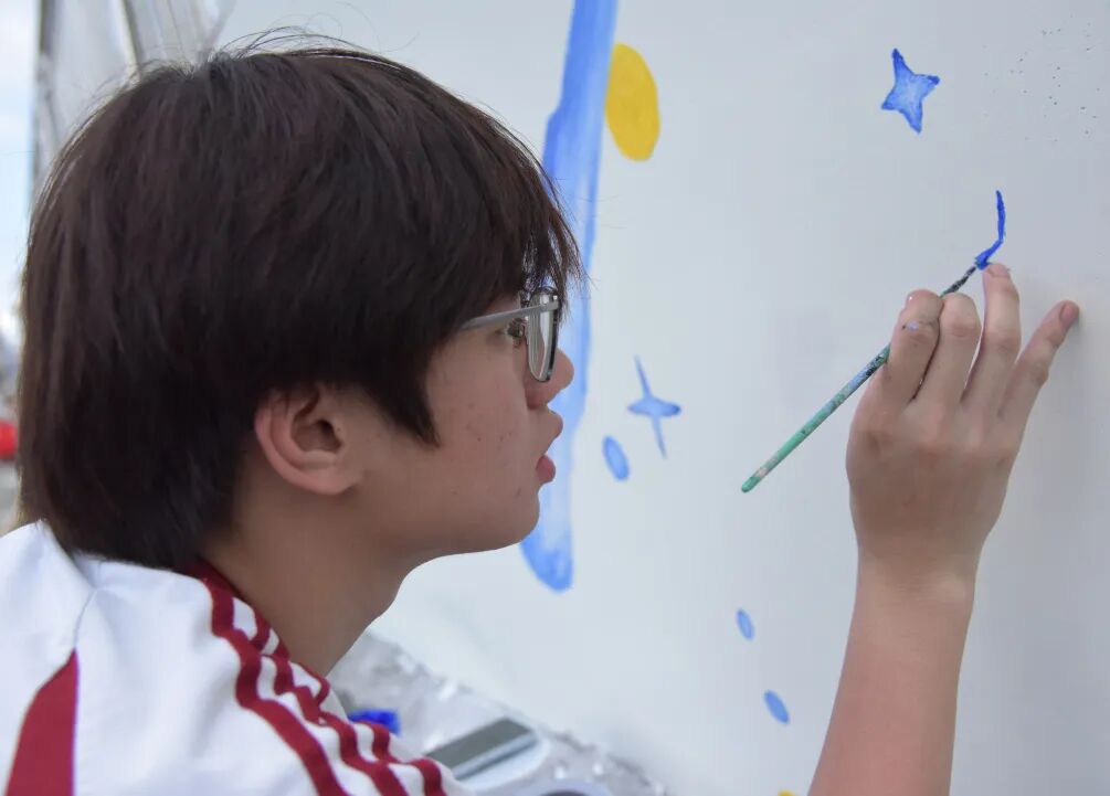面对丰富的渐变色挑战,队员们反复调试颜色,有人感慨道:“这个渐变色太难调了,都调好几遍了。”为达到理想效果,他们不断尝试湿画法与干画法的切换,甚至借助纸巾擦拭来塑造渐变层次,颜色不准就重新覆盖涂抹。随着色彩一笔笔铺开,原本单调的墙面逐渐生动,红韵也随之跃然墙上。