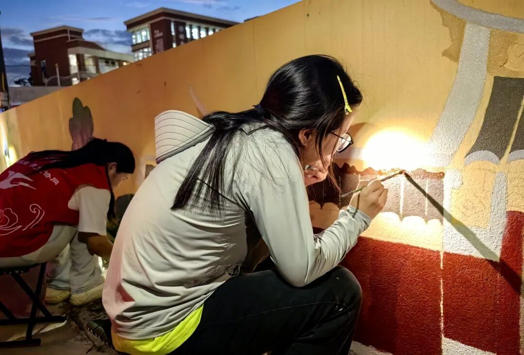 傍晚时分,夕阳的余晖为墙绘镀上一层温暖的金光。灯光亮起,闪光灯在夜色中勾勒出作品的轮廓,队员们继续完善细节,直到最后一笔落下,才露出欣慰的笑容。