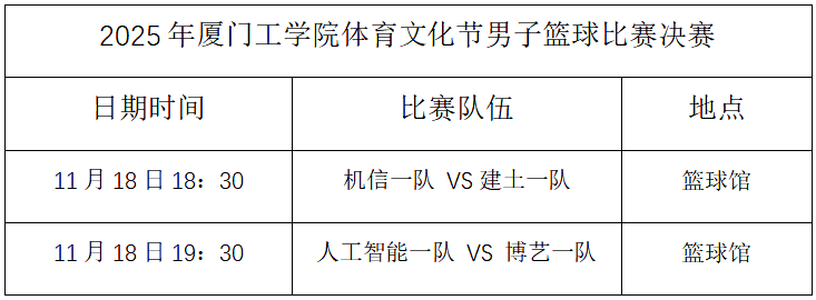 2025年厦门工学院体育文化节篮球赛决赛将于11月18日正式打响!四支劲旅会师赛场,为争夺最终荣耀展开激烈交锋。愿球员们在攻防两端尽显风采,以默契配合穿透防线,用顽强拼抢捍卫阵地,用精湛球技与昂扬斗志,为冬日校园点燃一场激情四射的篮球盛宴。