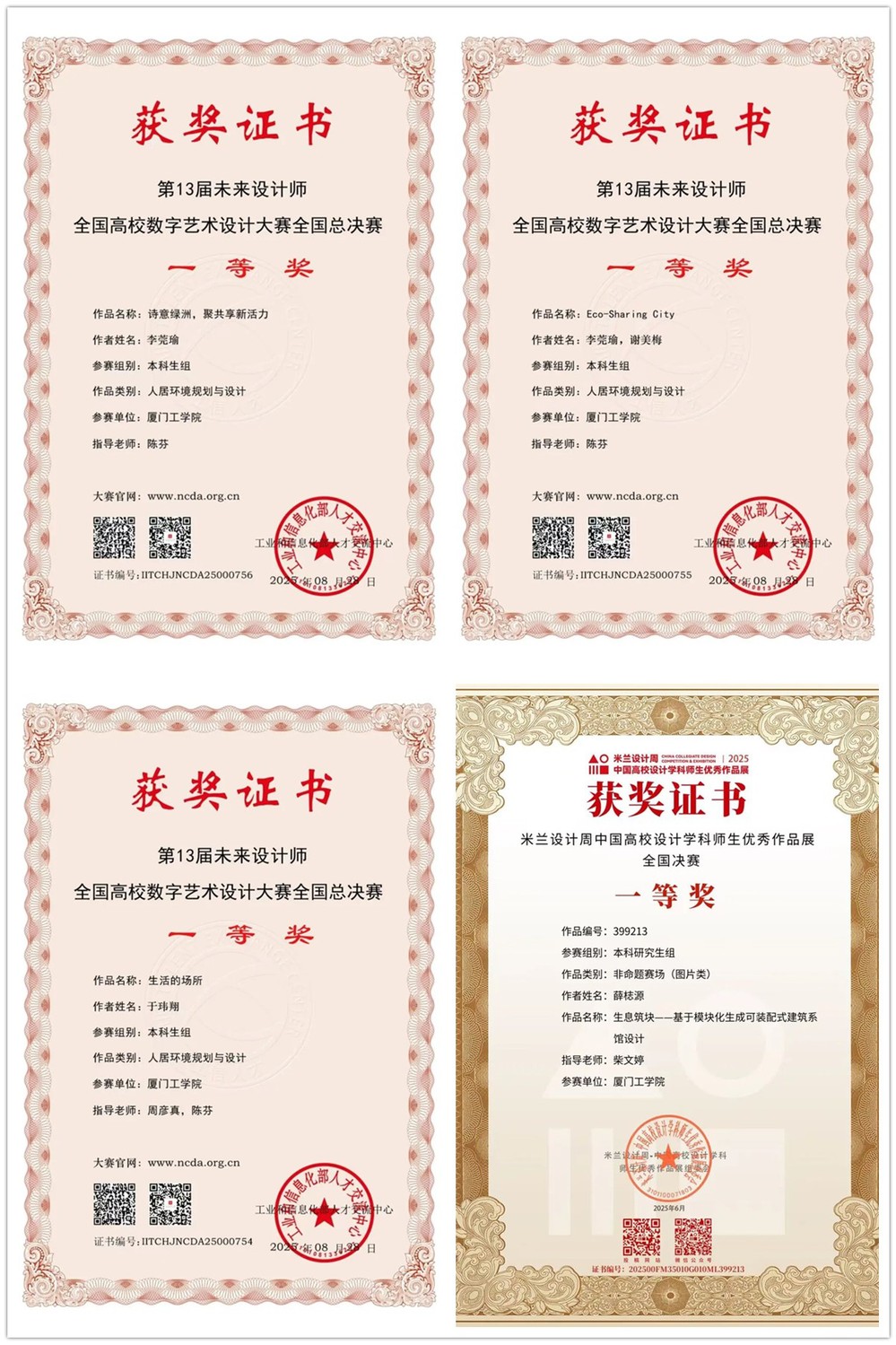 学院始终坚持以赛促学、以赛促创,构建“课程—项目—竞赛”三位一体的创新创业教育体系。2025年,我院学子在各类高水平学科竞赛中再创佳绩,累计荣获国家级奖项60项、省级奖项166项,其中国家一等奖11项。在中国国际大学生创新大赛(2025)校赛中,我院项目荣获红旅赛道一等奖,主赛道二等奖;在“米兰设计周”“未来设计师”等国际性赛事中,学生作品荣获国家级以上奖项28项。这些成绩充分展现了我院学生扎实的专业基础、出色的创新能力和良好的团队协作精神。